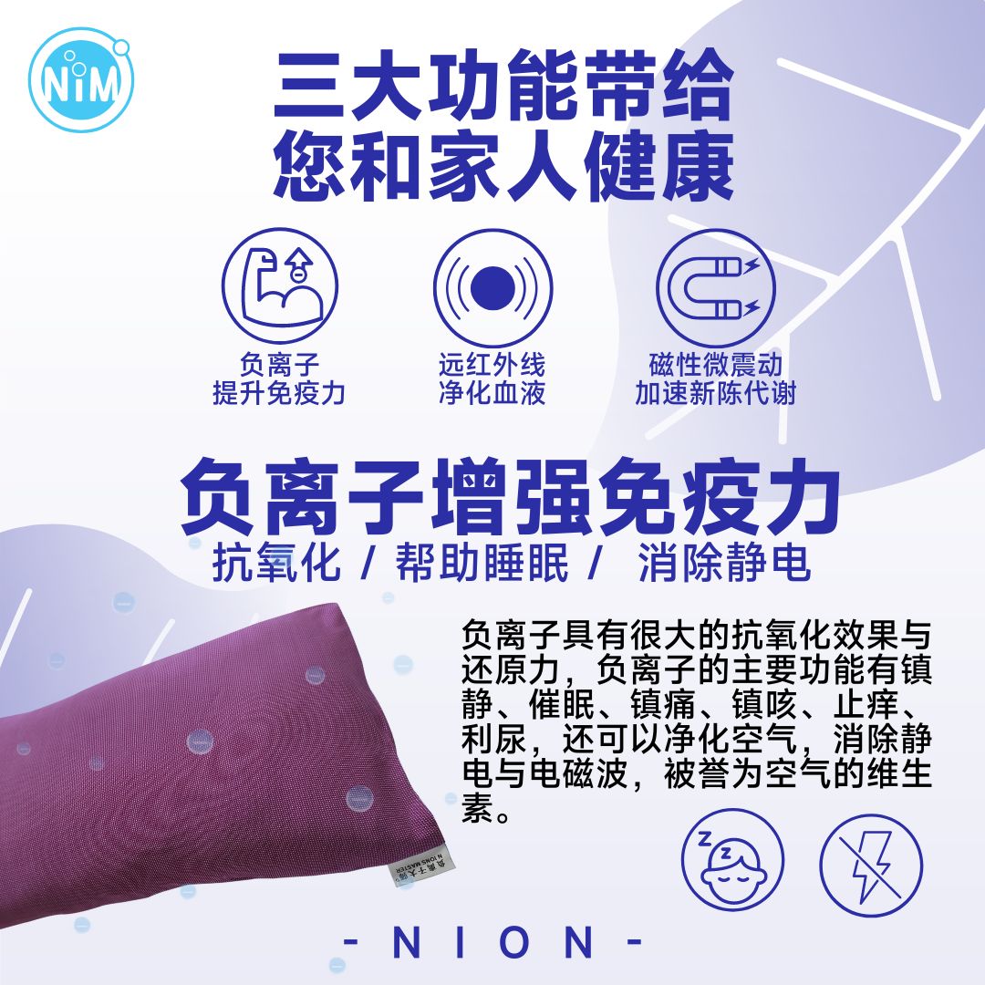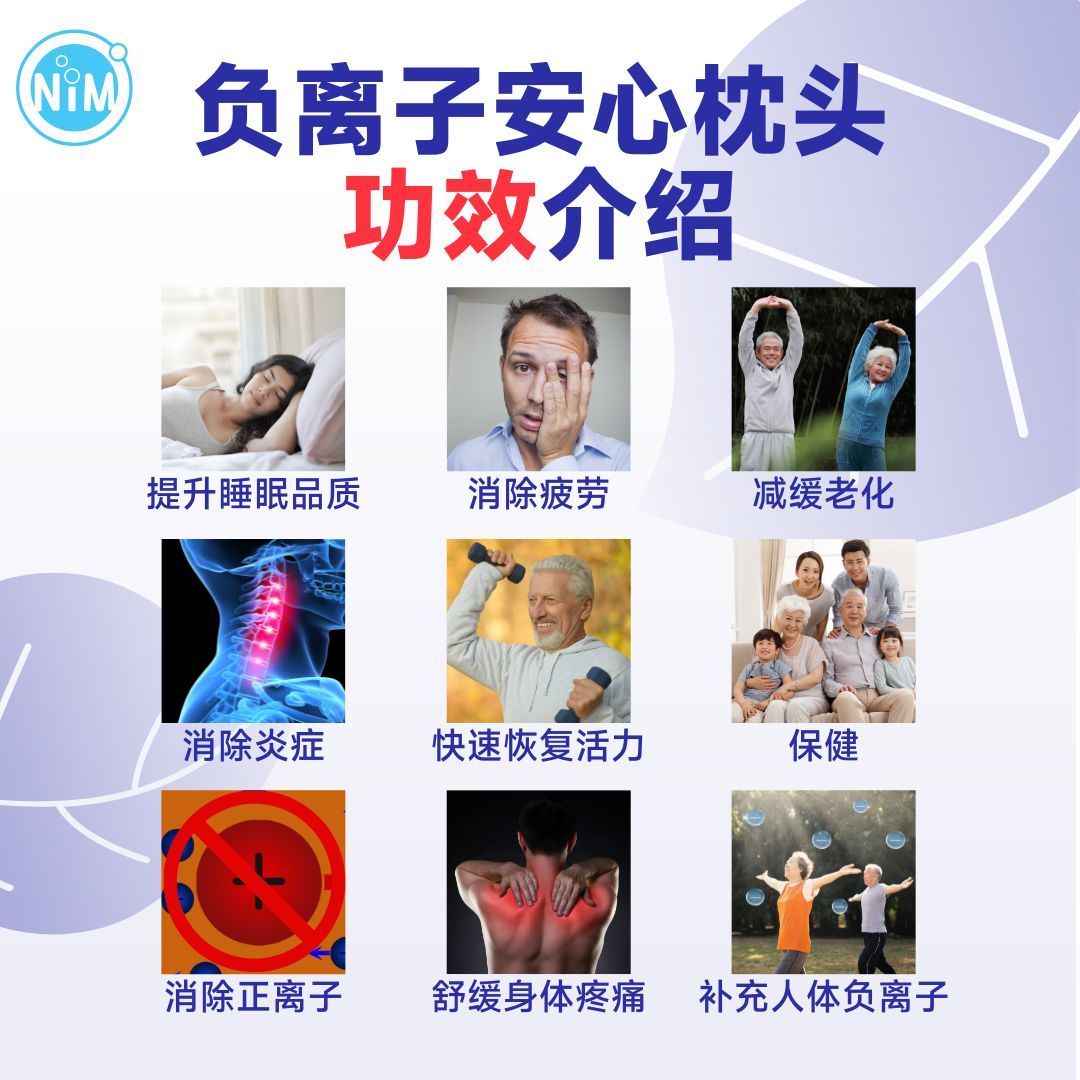 功效:舒缓以下症状:帮助人体补充负离子、改善失眠、改善夜尿、 改善身体酸痛、帮助减低消除对人体有害的正离子辐射、胸部疼痛问题