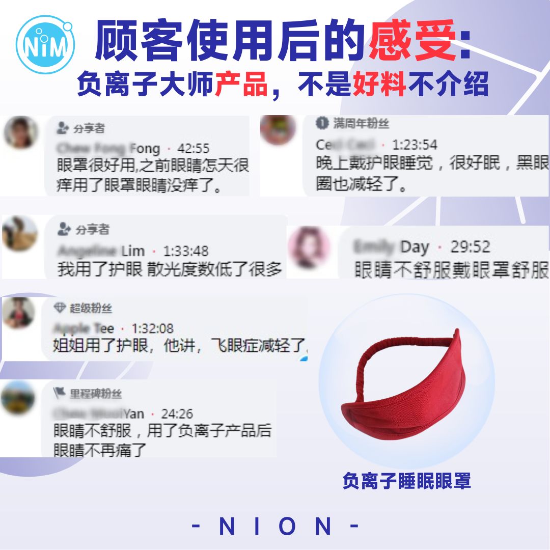使用负离子眼罩的感言:洗澡后,有很多时候,眼睛会红红的。用上眼罩后,改善很多了。谢谢负离子大师的产品。