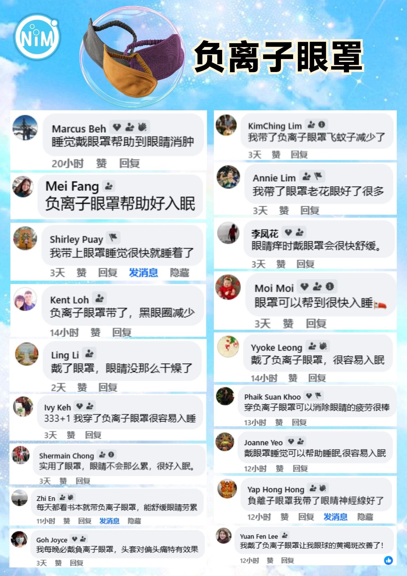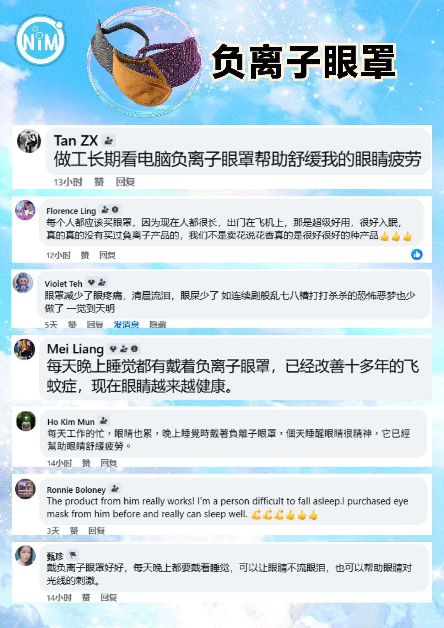使用负离子眼罩的感言:平时只要有休息时刻,我会带着眼罩,小休后,眼睛也没这么累,又可以轻松保养👏👏